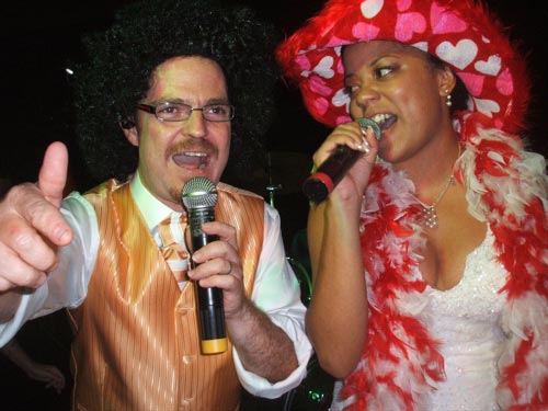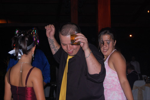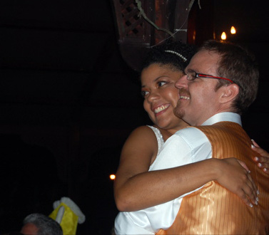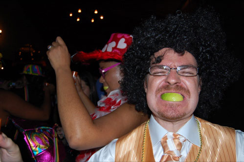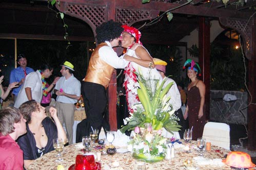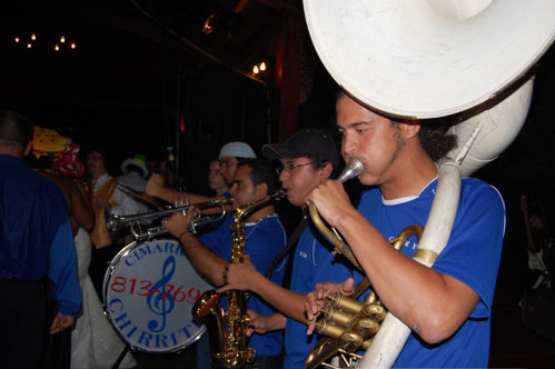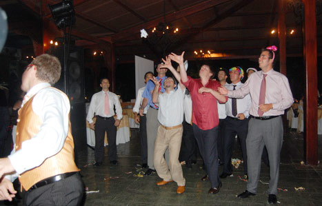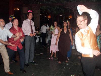 Luego, cuando todos pensamos que hacía falta que trajeran un balón de oxigeno para reanimar al personal llegó la CIMARRONA. Hay un momento en la mayoría de las bodas de aquí en que se celebra un carnaval. En cada mesa se reparten bolsas con pequeños accesorios carnavaleros como gorros, gafas, colgantes, pitos, bocinas, serpentinas, etc y una vez que la gente se los pone entra la cimarrona, que es como una banda de pueblo que toca música alocada. Para que me entiendan los lectores cinéfilos, la cimarrona toca música del estilo de la que se oyé en las películas de Kusturica.