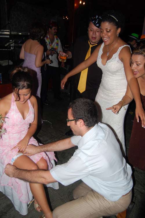 La tradición manda que el chico que agarra la liga ha de ponersela a la chica que consigue el ramo. Jordi le subió la liga a Mariela hasta casi las amigdalas. Observad la cara de Manino y Magui, hermano y madre de Mariela respectivamente.