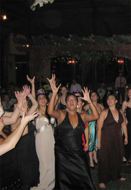 Llegó el momento del lanzamiento del ramo. Shara, la hermana de Denise (en el centro de la foto) estaba dispuesta a pelearse con uñas y dientes por agarrarlo, pero al final la afortunada fue Mariela, la prima de Denise, de 17 años. Como la tradición sea se nos va a casar muy jovencita.