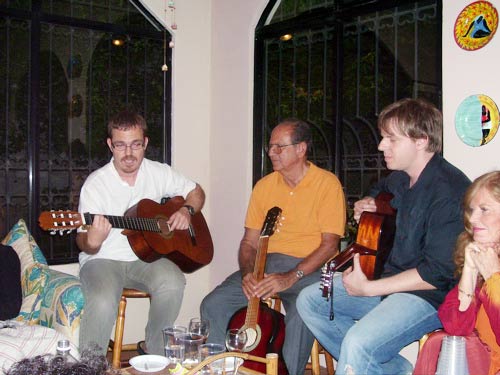 Mi padre interpretó un tema más y en seguida me tocó cantar a mi. Canté "Tres Regalos", una canción típica de las serenatas. En principio yo iba a cantar solo en inglés, pero cambié de opinión hace cosa de un mes, mientras buscaba la letra y los acordes de esta canción para enviárselos a mi padre. Me gustó tanto la melodía que me la adjudiqué. No suelo cantar en español y menos canciones como esta a las que hay que echarles volumen, pero creo que me salió bastante bien. De hecho, la audiencia se emocionó tanto, que me entró la risa a mitad de canción al oír el coro de moqueos a mi alrededor. :)